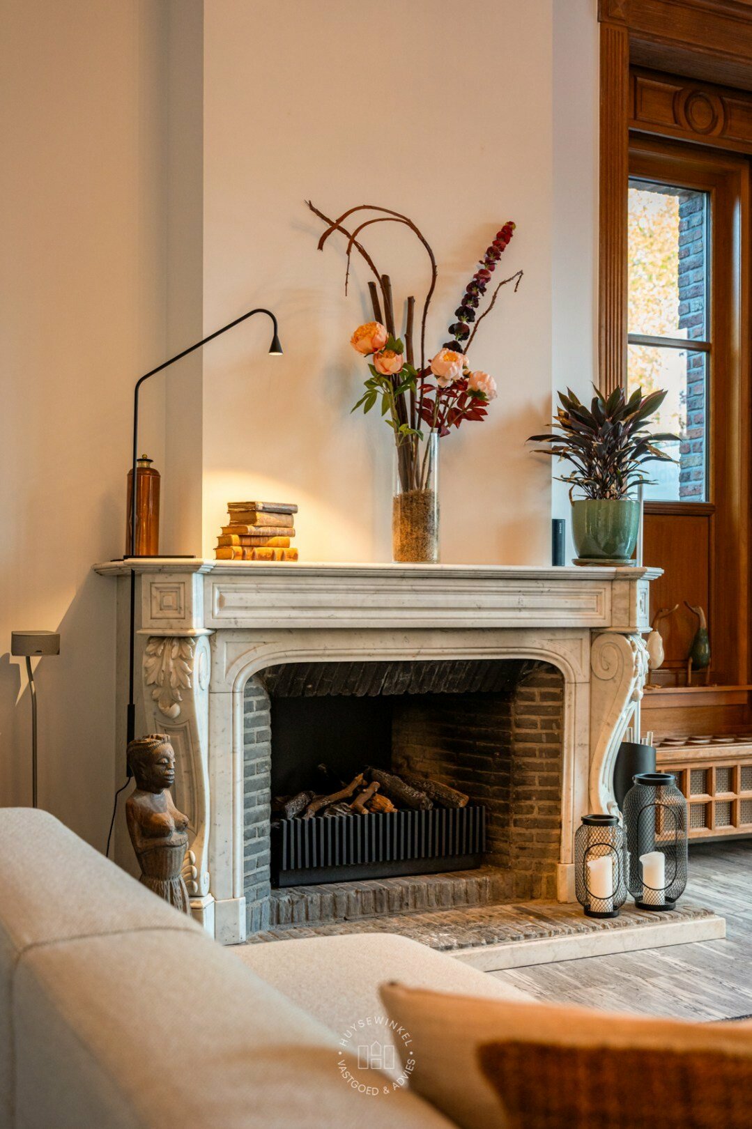 De natuurstenen vloeren, houtaccenten en de marmeren schouw benadrukken de authentieke charme, gecombineerd met moderne afwerking en comfort.