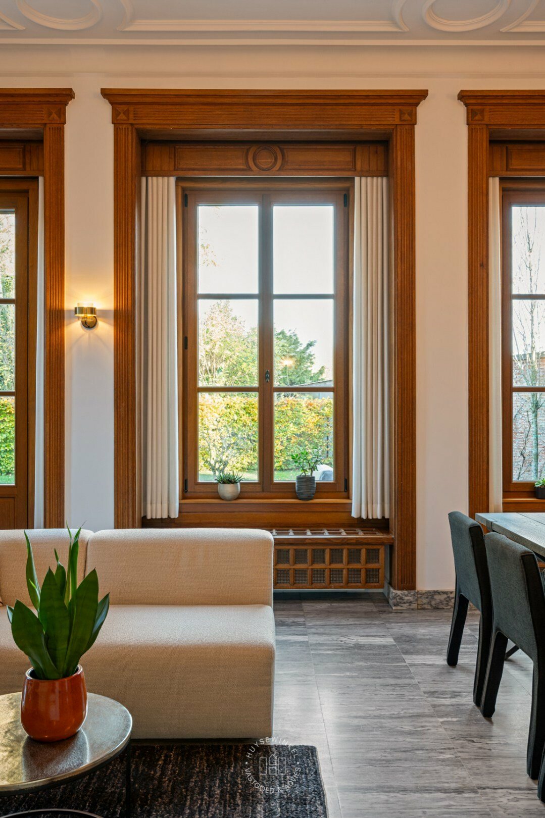 Bij binnenkomst springen de 4 meter hoge plafonds met verfijnde moulures meteen in het oog. Ze creëren een uitzonderlijk gevoel van ruimte en luxe in de volledige leefzone. De open indeling met keuken, eetkamer en leefruimte vormt het warme hart van het appartement. Grote raampartijen zorgen voor een overvloed aan natuurlijk licht en bieden een direct zicht op de privatieve tuin met ruim terras – een zeldzame troef die zorgt voor een ongeëvenaarde woonervaring.