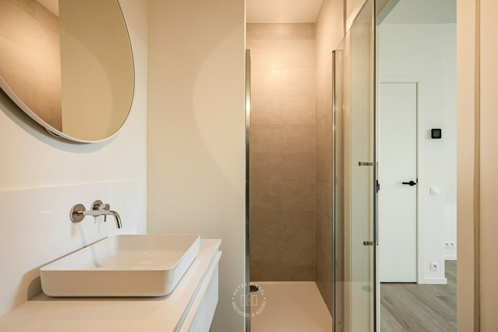 Het appartement is voorzien van een stijlvolle en kwalitatieve afwerking. Zo zijn er op maat gemaakte kasten, tegelparket en vloerverwarming aanwezig doorheen het appartement alsook zonnepanelen.