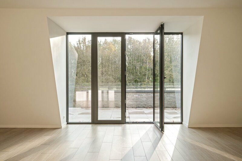 Dankzij de ligging op de bovenste etage beschikt het appartement over de nodige privacy en een prachtig uitzicht. De entree geeft toegang tot de royale leefruimte. Kenmerkend aan deze ruimte zijn de hoge plafonds in combinatie met de diverse raampartijen en de toegang tot het Zuid gericht zonneterras. De keuken is uitgerust met de nodige toestellen en biedt plaats voor een ontbijttafel. Troef is de aansluitende praktische bijkeuken. Palende aan de leefruimte is er eveneens plaats voor een bureau of leeshoek. De nachthal geeft toegang tot het slaapgedeelte. Hier bevinden zich drie slaapkamers, waaronder de master bedroom met ensuite badkamer en dressing. De twee andere slaapkamers hebben ook elk een eigen ensuite douchekamer.