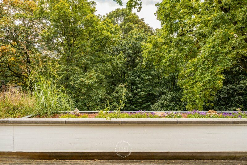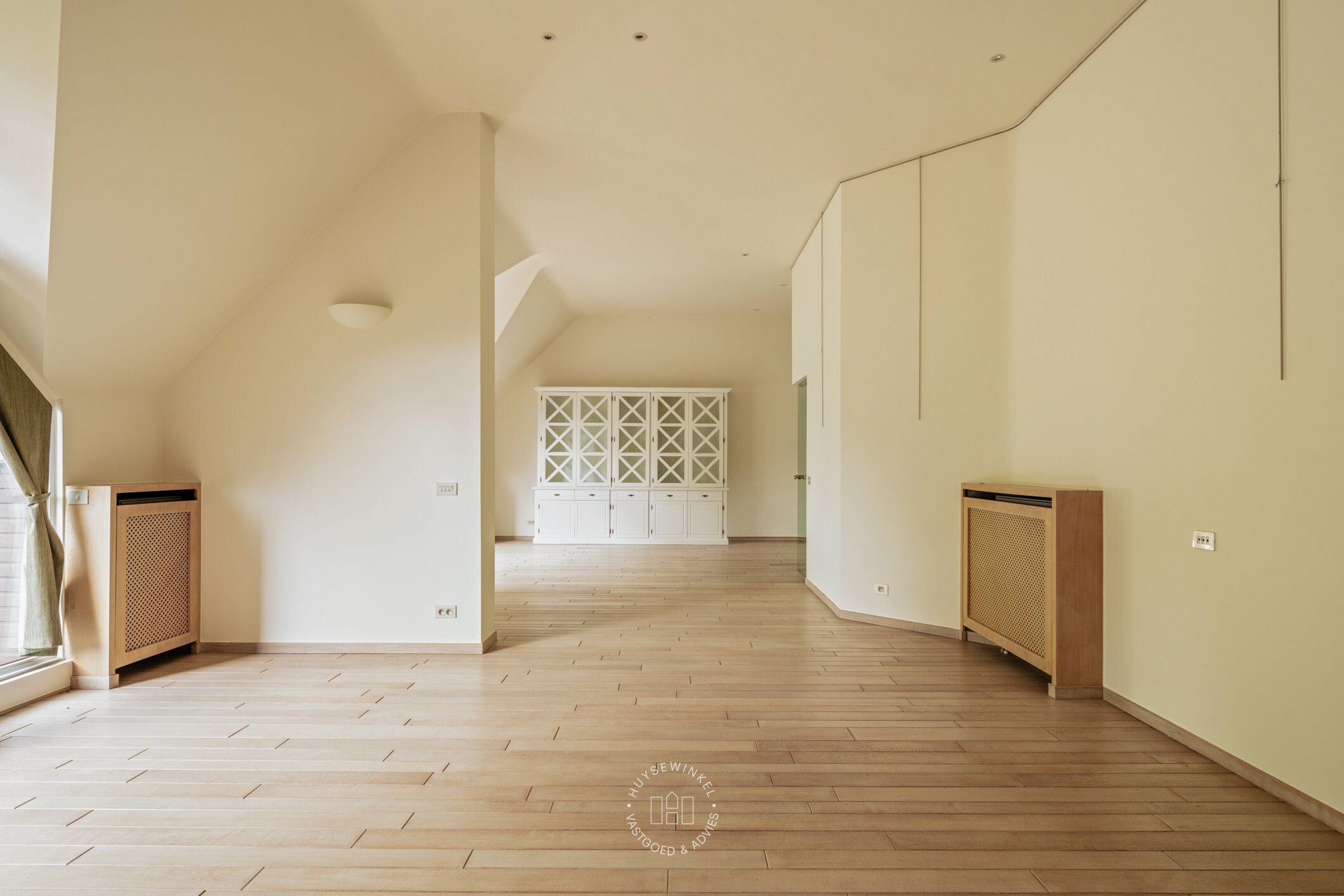 Dankzij de ligging op de bovenste etage beschikt het appartement over de nodige privacy en een prachtig uitzicht. De inkomhal geeft toegang tot de ruime leef- en eetruimte. Kenmerkend aan deze ruimtes zijn de hoge plafonds in combinatie met de diverse raampartijen en de toegang tot het ruime zonneterras.