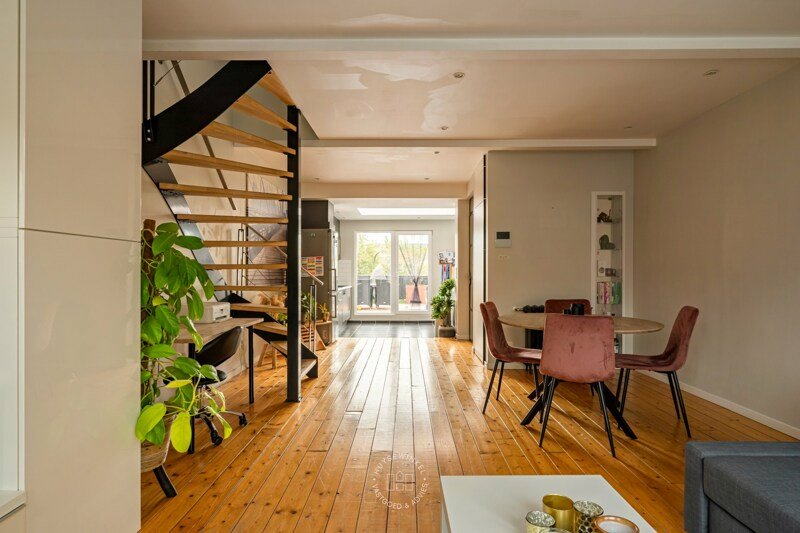 Via de aparte inkomdeur met ingemaakte kansen en stalen trap betreden we het appartement. Net zoals het magazijn werd het appartement volledig vernieuwd. Dit zowel technisch als esthetisch. Eens boven worden we verwelkomd door een open eet- en leefruimte, op mooie plankenvloer wat deze ruimtes extra karakter geeft. De keuken, met ontbijthoek, werd ingericht met alle hedendaagse apparaten. Van hieruit hebt u tevens via een schuifraam toegang tot het royale terras. Op de tweede verdieping vinden we twee slaapkamers en een badkamer voorzien van toilet, lavabomeubel en inloopdouche.