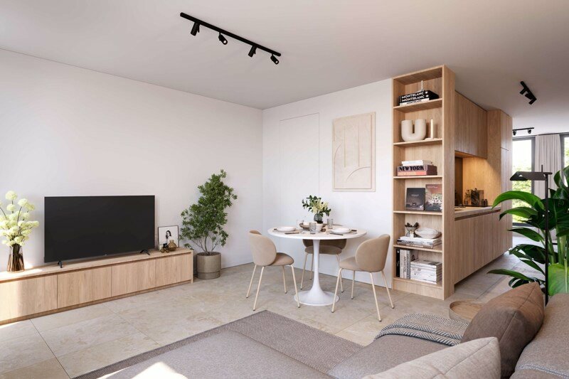 Op de tweede verdieping bevindt zich deze ruime studio met één slaapkamer. Dankzij de praktische indeling geniet u van een aangename ruimte. De plaats waar jonge starters binnenkort terecht kunnen. Hier hebben ze een warm en gezellig nest om zich in alle rust terug te trekken. Al zijn ze nooit alleen, want in de collectieve ruimtes is er altijd wel iemand om een praatje mee te slaan. Dit project biedt een interessante investering. Alle appartementen beschikken over één slaapkamer en zijn ideaal voor jonge starters. * Betaalbaar * Topligging in Kortrijk * Architectuur op hoog niveau * Uitgebreide gemeenschappelijke voorzieningen * Investeren met rendement * (huurrendement & waardestijging)